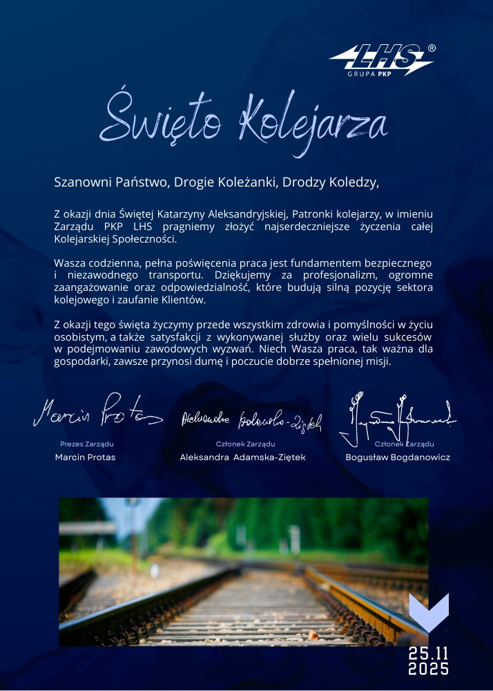 Wydarzenia Życzenia z okazji Święta Kolejarza PKP LHS 2025 Wydarzenia 2025-11-25 Życzenia z okazji Święta Kolejarza PKP LHS 2025 Przeczytaj także: 2026-01-22 Komisja Infrastruktury 2026-01-14 Zarząd PKP LHS uczestniczy w Forum Infrastruktury i Gospodarki w Łodzi 2025-12-31 Promocja w PKP LHS dla branży nawozowej 2025-12-23 Promocja Świąteczna i Noworoczna w PKP LHS